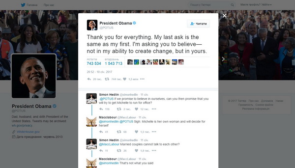 Останній твіт Обами в якості президента США отримав найбільше «лайків» та поширень, порівнюючи з усіма його попередніми записами, повідомляє Cnet.